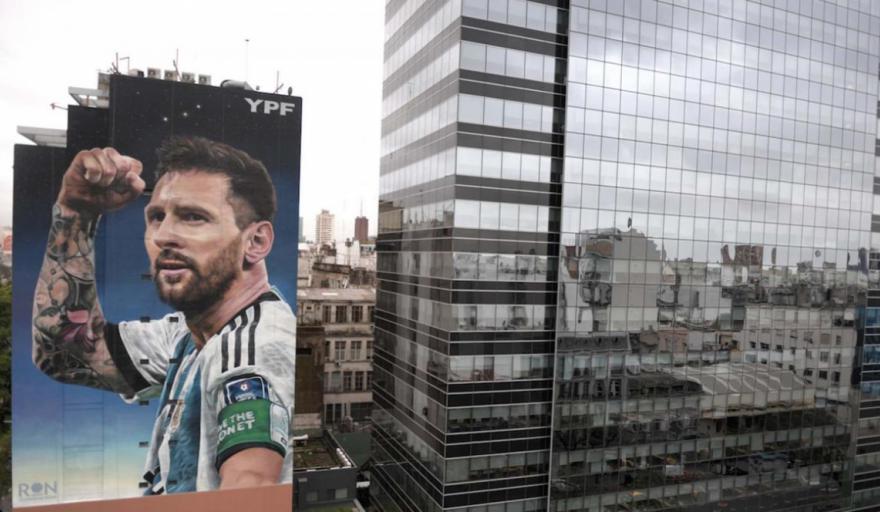 La enorme figura de Lionel Messi, con la camiseta argentina con tres estrellas, la cinta de capitán y su puño en alto es una de las escenas que Ron plasmó en el lateral de un edificio del barrio porteño de San Cristóbal en un mural de 35 metros de alto.