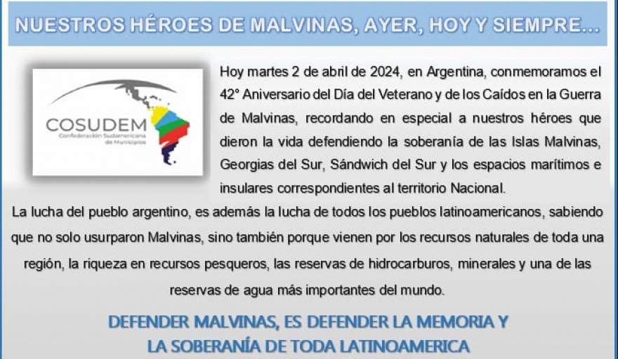 Con motivo de conmemorarse un nuevo aniversario del desembarco argentino en las Islas Malvinas, los jefes comunales integrados en la Cosudem, expresaron taxativamente que “Defender Malvinas, es defender la memoria y la soberanía de toda América del Sur”.