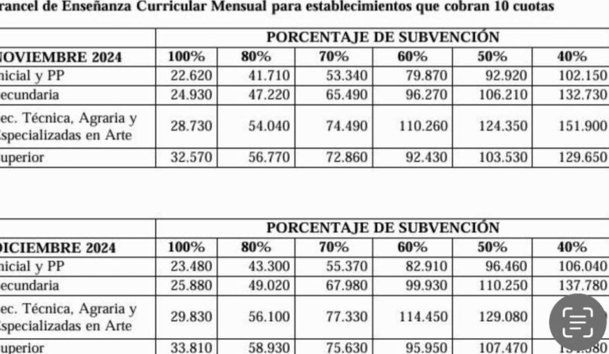 A continuación se adjunta el cuadro con los nuevos topes tarifarios para cada categoría y para cada nivel de enseñanza.