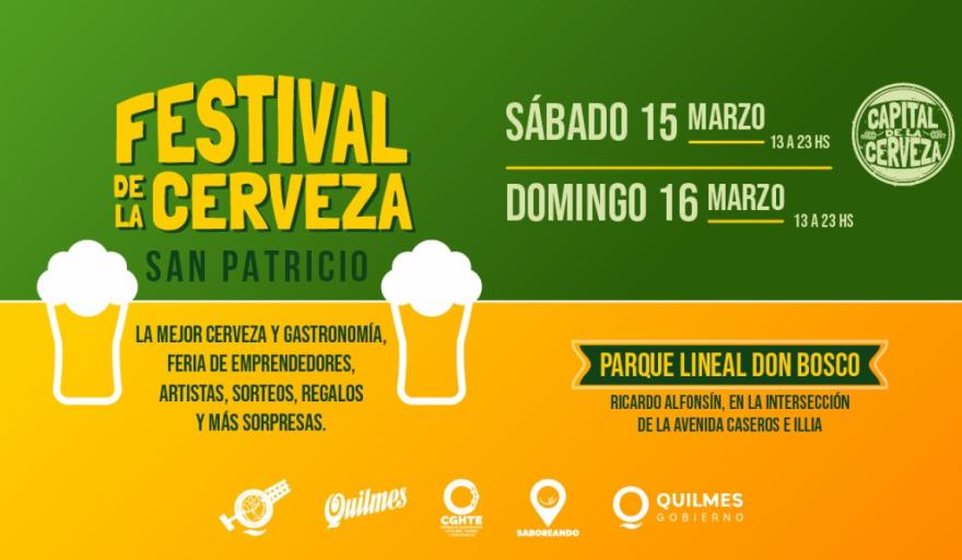 El Municipio de Quilmes informa que este sábado 15 y domingo 16 de marzo, de 13 a 23, se realizará una nueva edición del “Festival Cervecero, edición San Patricio”, en el Parque Lineal Don Bosco, ubicado en la intersección de la avenida Caseros e Illia. La misma es una iniciativa municipal en articulación con los cerveceros y la cámara gastronómica local.