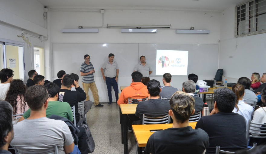 La charla fue dictada por representantes de Marlew, empresa argentina con más de 50 años de trayectoria que fabrica, comercializa y distribuye conductores eléctricos, especialmente cables industriales: Martín Molinelli (Jefe de Procesos) y Fernando Álvarez (Gerencia de Ingeniería). “El objetivo es mostrar cómo es el proceso productivo de un cable, desde que comienza hasta su finalización”, comentaron inicialmente, y explicaron la definición de cable (“conjunto de conductores y/o fibras ópticas que tienen cubierta protectora”) y de conductor (“elemento destinado a transportar corriente eléctrica”), y los usos generales de un cable: “Para potencia (llevar energía a un dispositivo eléctrico) y de señales (para transmitir datos o información)”.