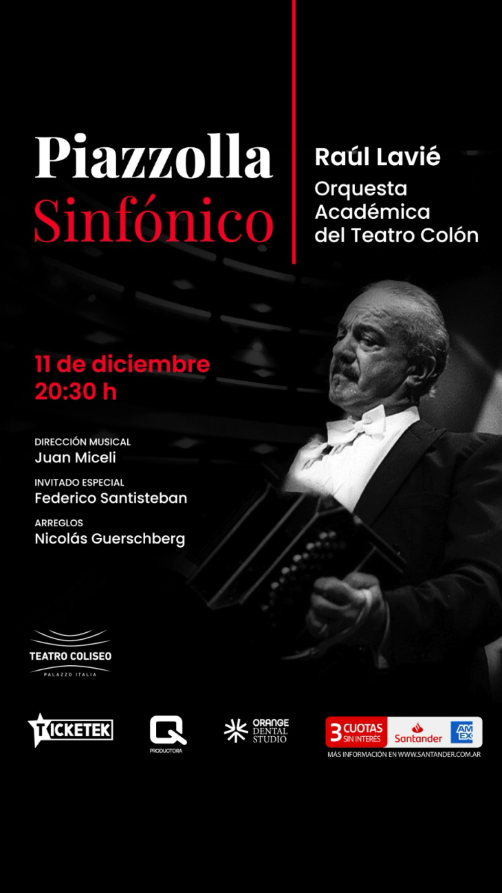 Celebrando el Día Nacional del Tango, el jueves 11 de diciembre, a las 20:30h, se realizará un concierto que promete ser inolvidable: Piazzolla Sinfónico en el Teatro Coliseo, en el que un elenco de notables figuras rendirá homenaje a Astor Piazzolla con un programa que recorrerá sus obras icónicas, en una experiencia sonora que une la potencia de la música sinfónica con la emoción profunda del tango.