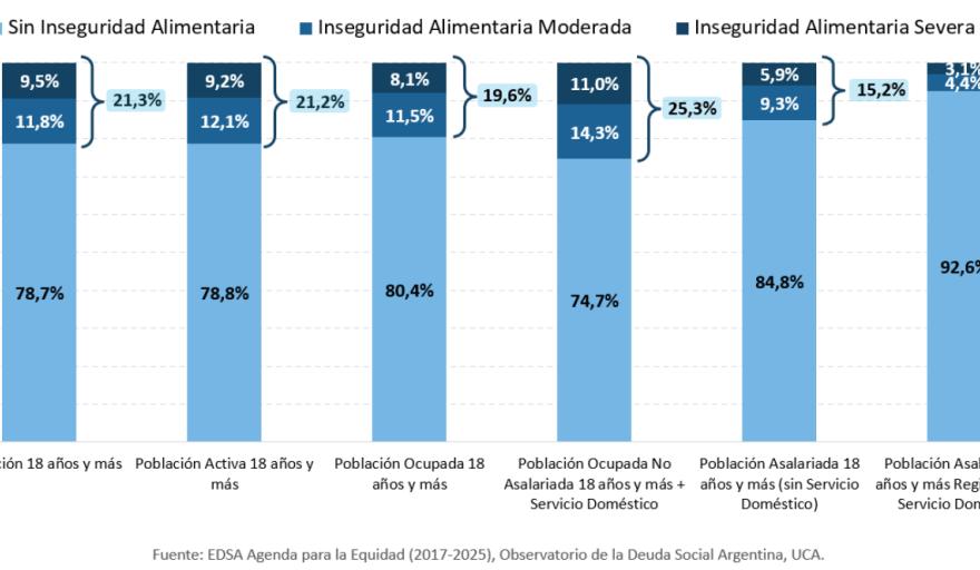 En ese contexto, se presentó el documento Seguridad Alimentaria de los trabajadores asalariados en la Argentina. Según el informe, entre 2022 y 2024, la inseguridad alimentaria afectó, en promedio, al 15% de los trabajadores asalariados, incluso aquellos que cuentan con un empleo formal (7%). Los que no aportan a la seguridad social presentan niveles superiores de inseguridad alimentaria notablemente superiores en comparación con aquellos con aportes. La precariedad laboral se asocia con una mayor vulnerabilidad alimentaria.