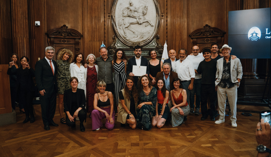 Para recibirlo, concurrieron el director Leo Prestia, integrantes de diversos elencos de Claveles Rojos y Andrea Proto, viuda del autor de la comedia dramática, junto a su hija.